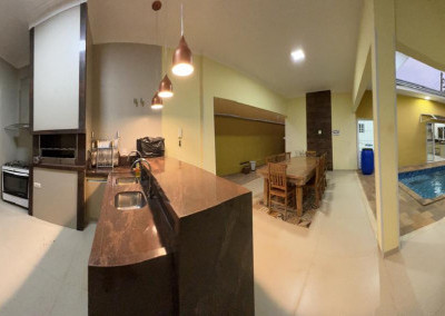 Varanda gourmet com churrasqueira, bancada e banheiro externo