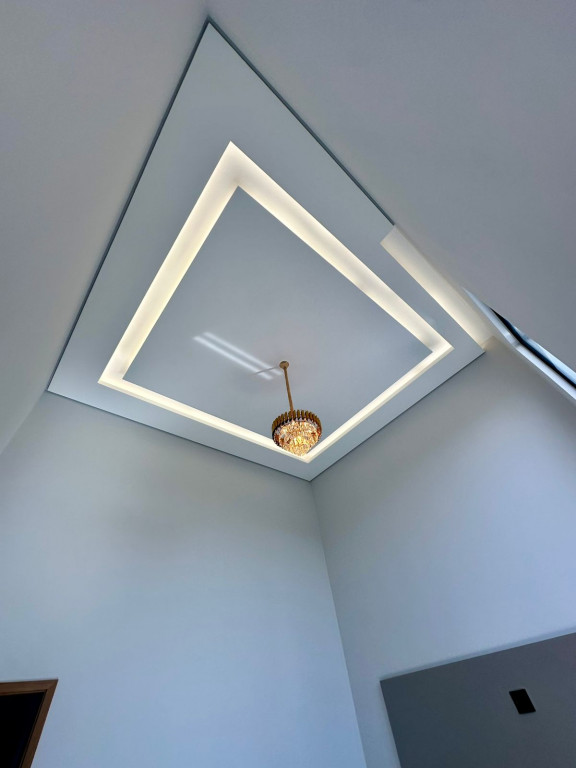 Sala aconchegante com painel e um lindo lustre