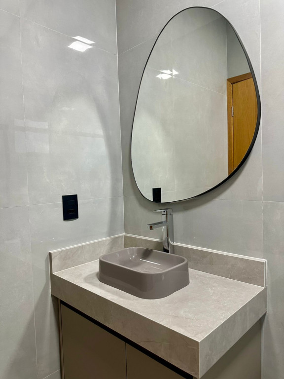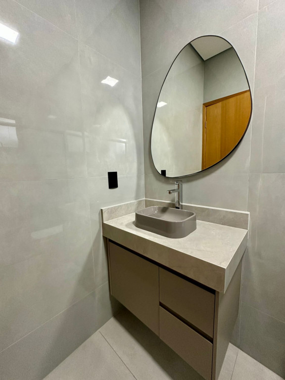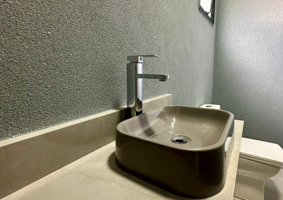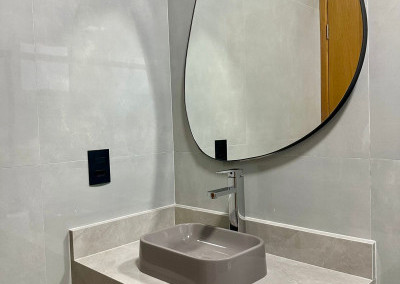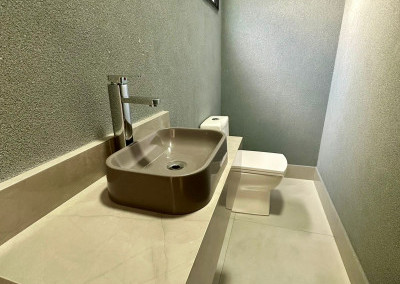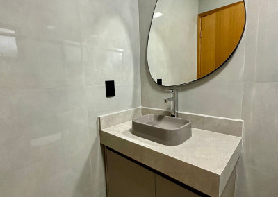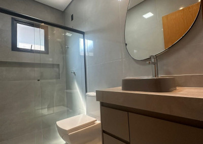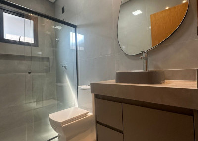 2 banheiros (social e da suíte) com box, pias com gabinete planejado e espelhos