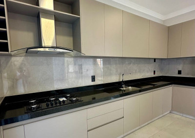 Cozinha planejada em dois ambientes, equipada com armários, coifa e fogão cooktop