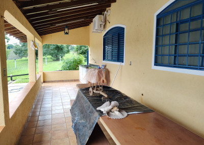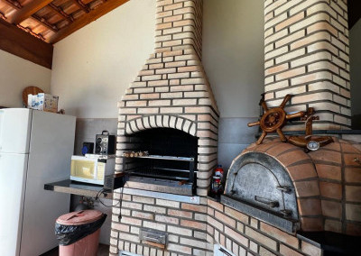 Área gourmet, com bancada de mármore, 2 mesas de vidro com 8 cadeiras , churrasqueira, forno à lenha, fogão industrial 4 bocas, banheiro